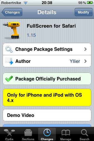 FullScreen has been tested to work on all iPhones and iPods running firmware 4.0 to 4.1. It also works well with other Safari extensions..