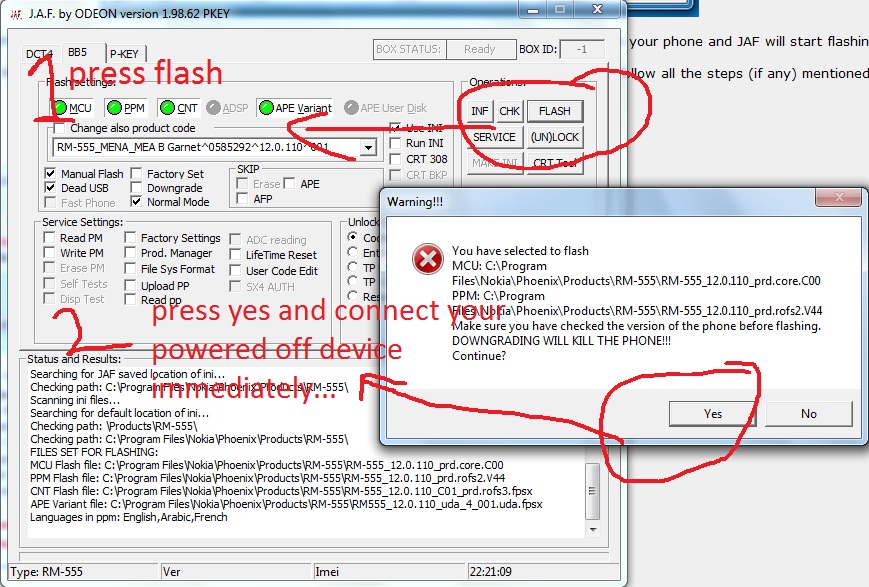 Now TURN OFF your phone !! and then click FLASH button after that press power button (don’t hold it) on your phone and JAF will start flashing.