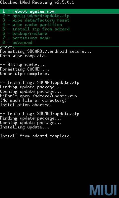 - When the progress bar completes and the message “install from sdcard complete” is shown at the bottom of the interface, it means that the flashing is done.