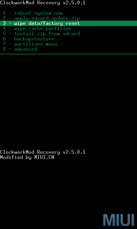 - Use trackball in the Recovery interface and click on 3-wipe data/factory reset, then choose 4 – yes -and also wipe sd-ext.